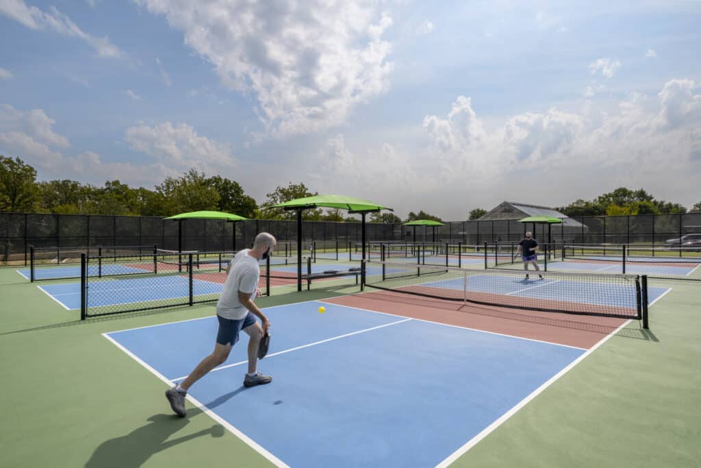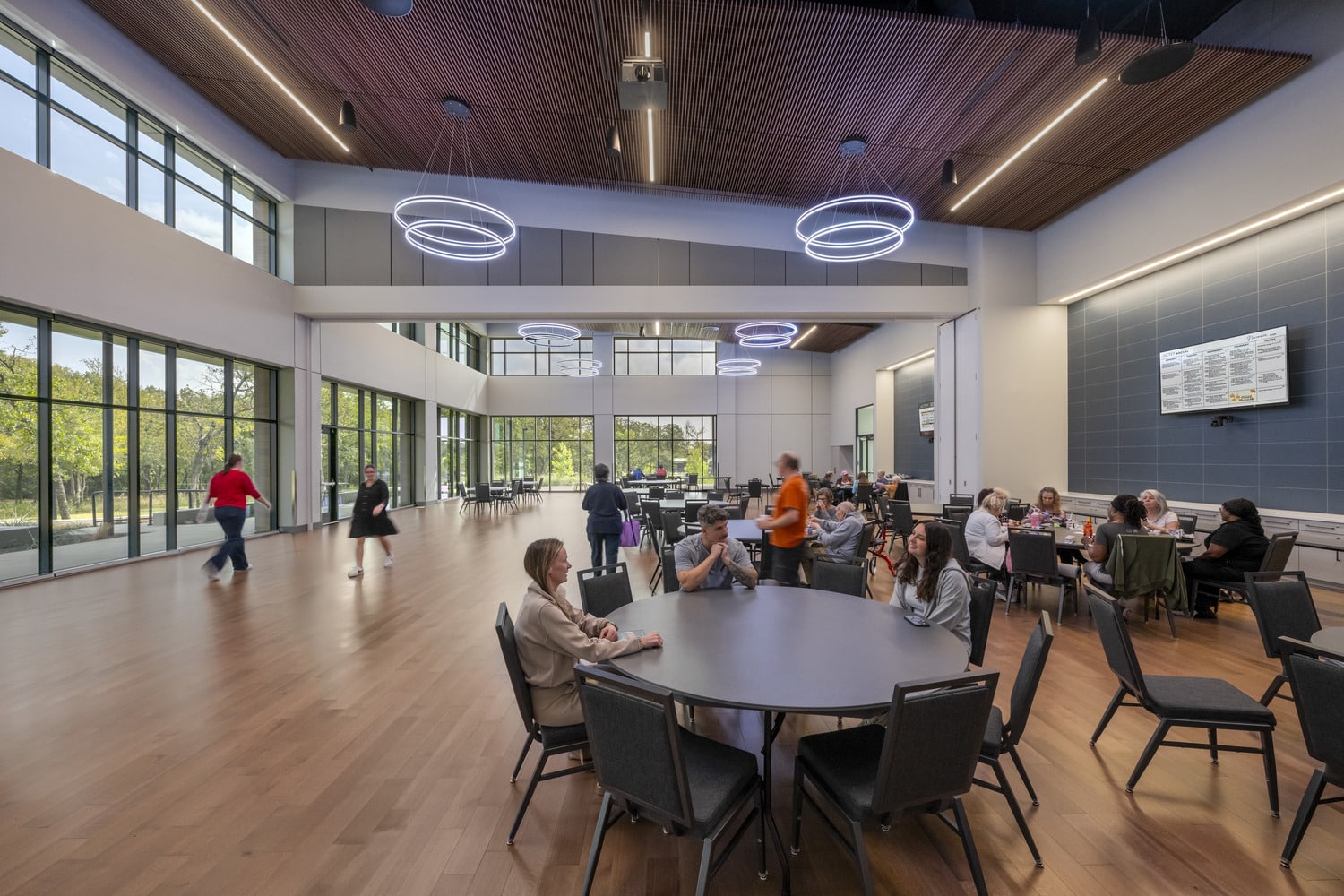 Parkhill’s design also incorporates outdoor recreation, adding an outdoor transitional workout lawn and pickleball courts. These features allow for active sports programs set against the natural backdrop. The entire east side of the facility opens up to the Post Oak preserve and activity lawn, providing stunning views and creating opportunities for outdoor programming.