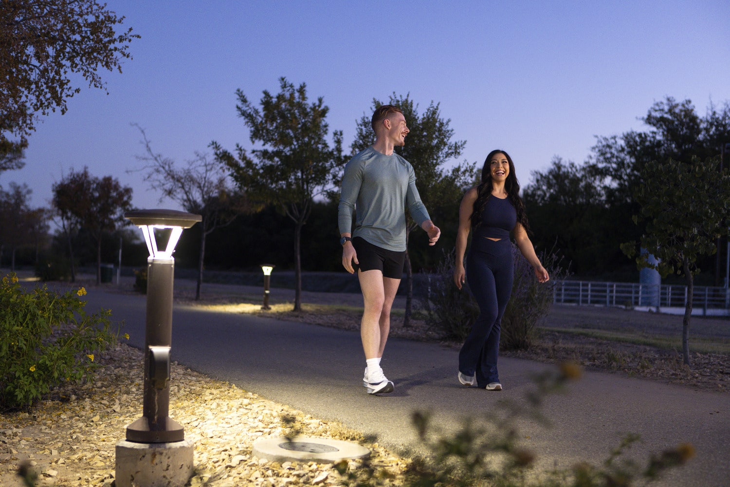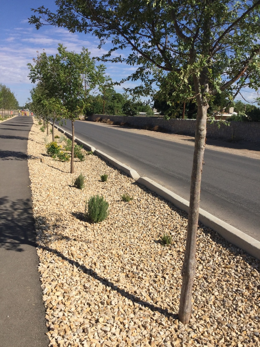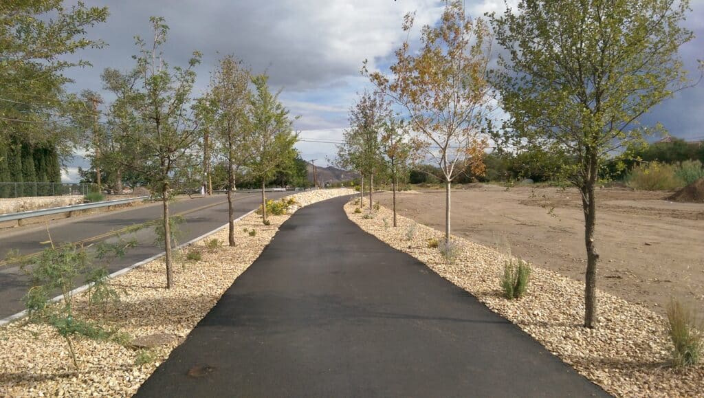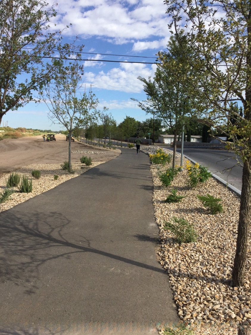 The design was phased: Phase I created a 12’ path with tree-shaded rain-harvesting swales; Phase II extended it, adding lighting, landscaping, and bus connections. With over 550 new trees, 2,700+ shrubs, and thoughtful stormwater features, this corridor now offers a cool, green, and connected space for people walking, biking, or waiting for a bus—proof that fast-track design can still plant lasting roots.