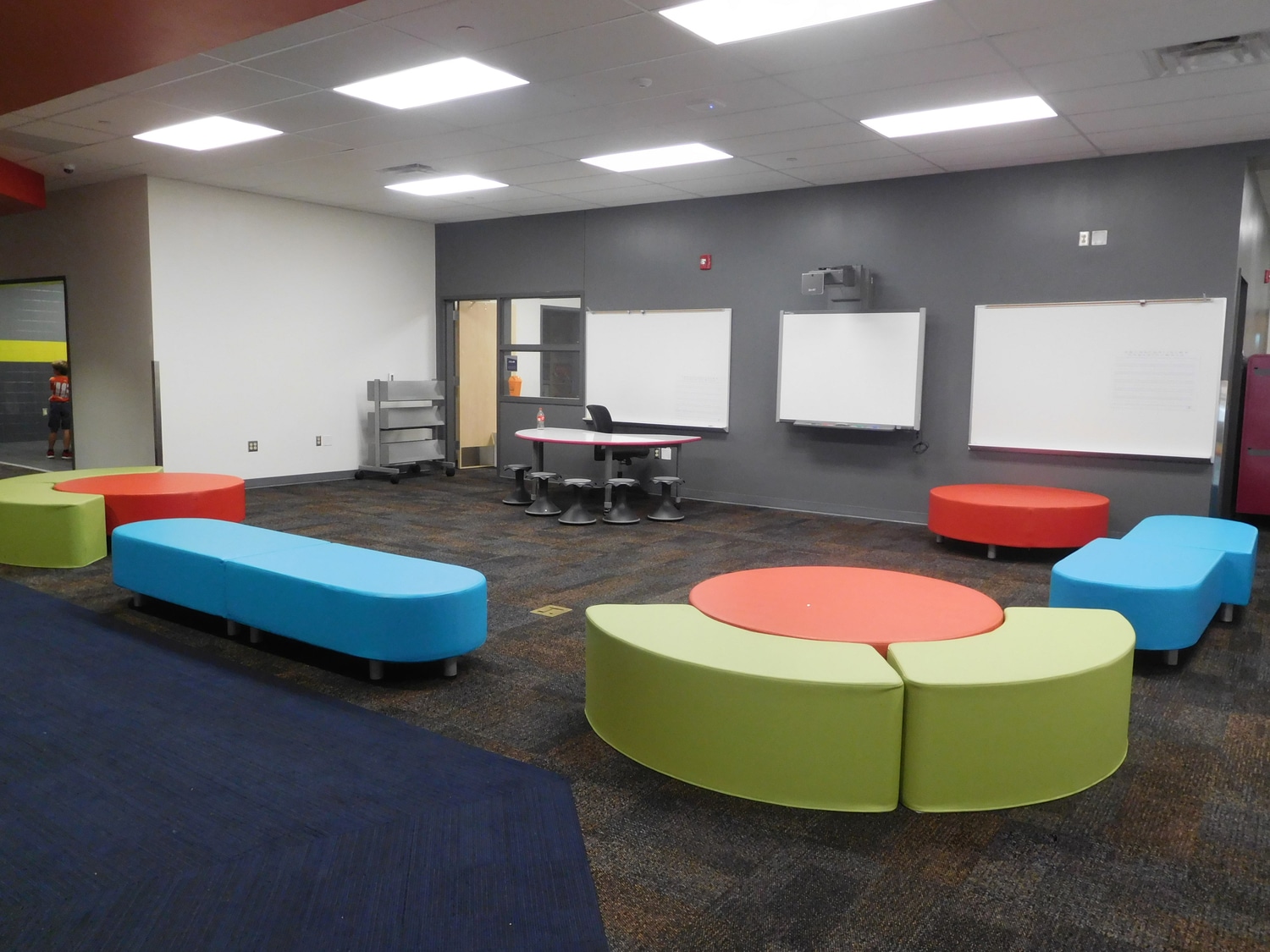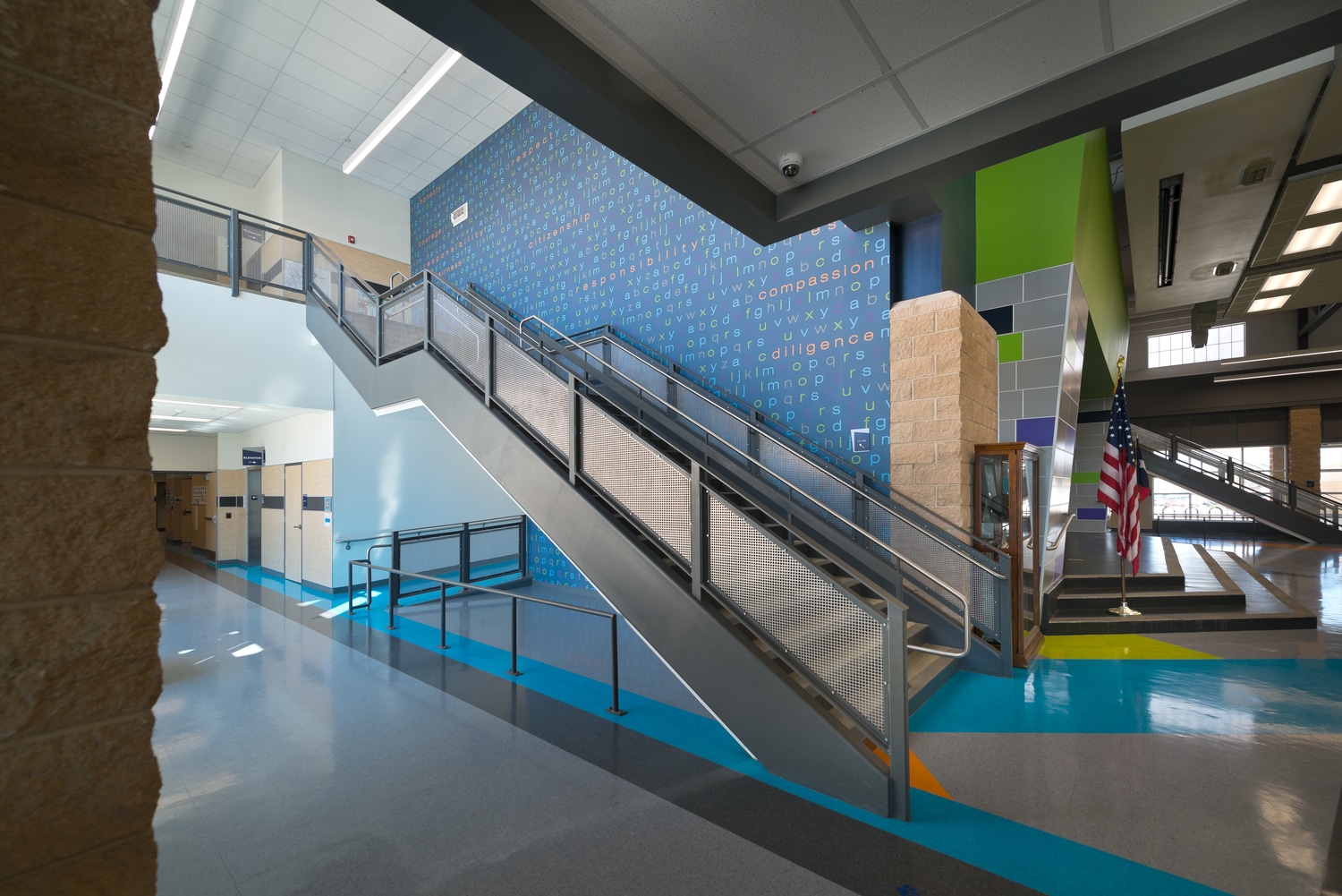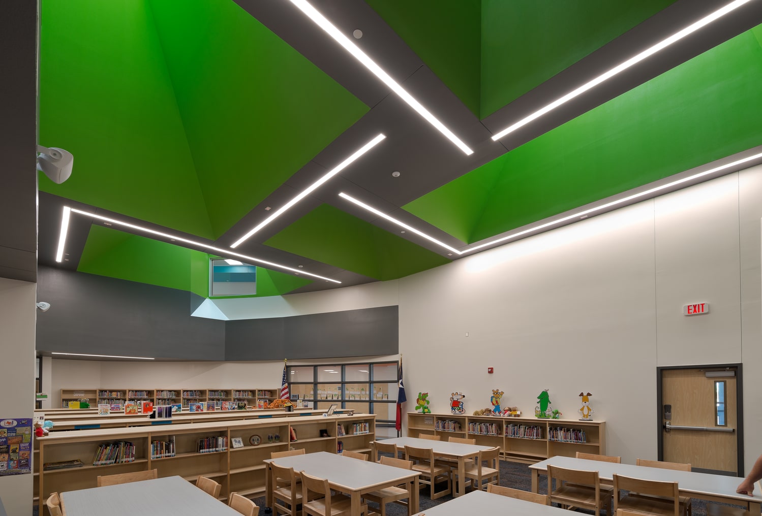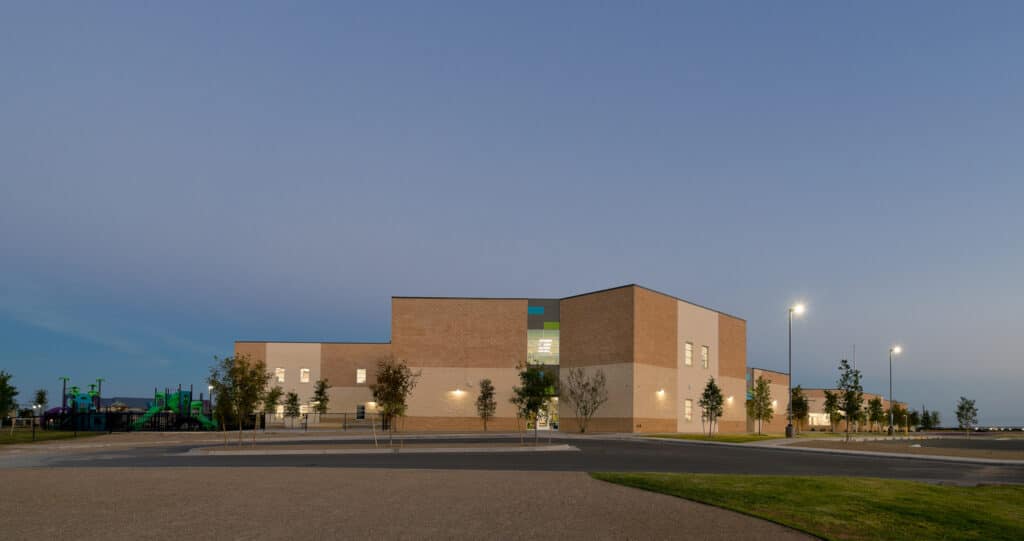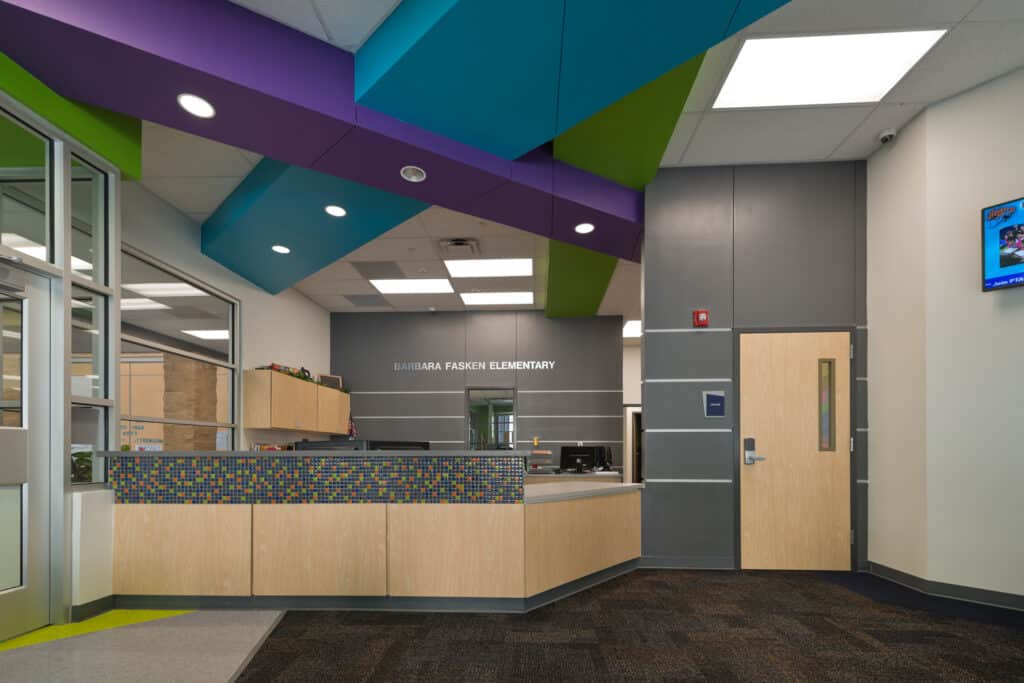 Barbara Fasken and Southwest Elementary Schools were designed for grades Pre-K through 6th, with each campus featuring 35 general classrooms, specials rooms, a gymnasium, cafeteria with stage, media center, and collaborative spaces. Each grade level is organized into its own “Neighborhood,” including a Multi-Purpose Instructional Area (MPIA), two to five classrooms, a teacher collaboration space, and one-on-one rooms for small group work or tutoring. Classrooms are connected by retractable, acoustically rated walls to support flexible group sizes and team teaching. The design reflects a balance between collaboration and focused learning.
