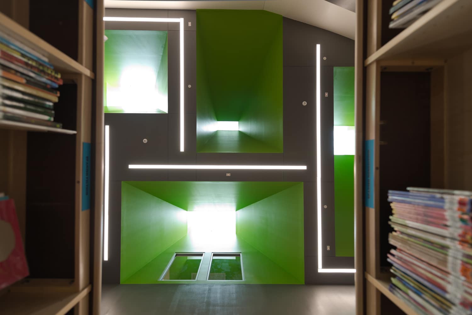 Each school includes terraced outdoor classrooms directly accessible from learning areas. A cistern collects HVAC condensate with visible piping to help students observe water collection in action—reinforcing environmental awareness and hands-on science learning just steps from the classroom.